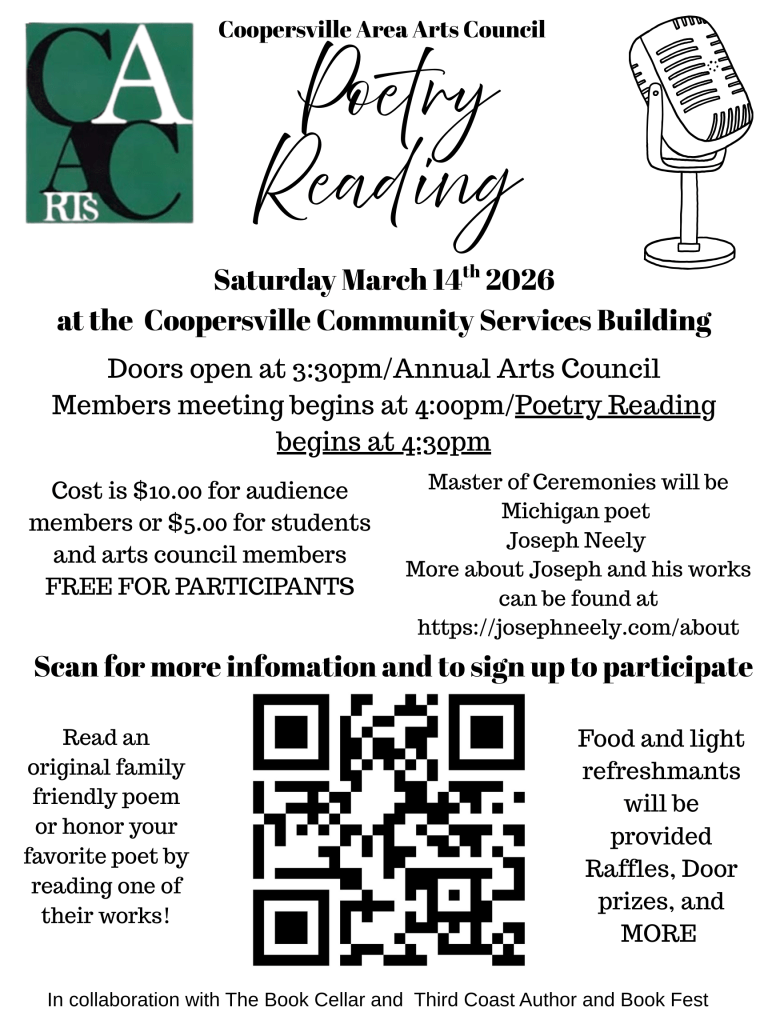 The event is being held in conjunction with the Third Coast Book Festival and will be MC’d by Michigan Poet Joseph Neely, who will also be sharing some of his works. In addition to the poetry, the Coopersville Area Arts Council will be providing a light meal, as well as Door Prizes and a Raffle. We hope to see you share your talents and/or enjoy the works of others. This is a great opportunity to showcase some of our local literary talent!